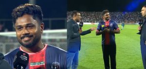 ‘ഈയടുത്ത് ‘സഞ്ജു മോഹന്ലാല് സാംസണെ’ന്ന് പറയുന്നത് കേട്ടിരുന്നു. ഇപ്പോള് നമ്മള് സൂപ്പര് ലീഗ് കേരളയിലാണ്. ഇവിടെ എന്തായിരിക്കും പേര് സ്വീകരിക്കുക? സഞ്ജു മെസി സാംസണോ സഞ്ജു റൊണാള്ഡോ സാംസണോ?’ എന്നായിരുന്നു അവതാരകന്റെ ചോദ്യം.