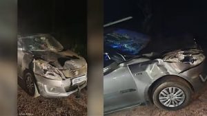 കൊമ്പനെ ഇടിച്ച് തെറിപ്പിച്ച് കാർ; ആന വീണ് കാർ തകർന്നു, യാത്രക്കാരെ ആക്രമിച്ചില്ല