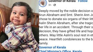 തിരുവനന്തപുരം: പത്തു മാസം പ്രായമുള്ള കുഞ്ഞ് ആലിൻ ഷെറിൻ എബ്രഹാമിന്‍റെ അവയവങ്ങൾ ദാനം ചെയ്തതില്‍ മാതാപിതാക്കളെ അഭിനന്ദിച്ച് ഗവര്‍ണര്‍. ജീവിതത്തിലെ ഏറ്റവും വേദനനിറഞ്ഞ നിമിഷത്തിലും കുഞ്ഞു മകളുടെ അവയവങ്ങൾ മറ്റുള്ളവർക്ക് നൽകാൻ തീരുമാനിച്ച മാതാപിതാക്കളുടെ തീരുമാനം അഭിനന്ദനാര്‍ഹമാണെന്ന് സാമൂഹിക മാധ്യമത്തില്‍ ഗവര്‍ൺര്‍ കുറിച്ചു. അപകടത്തിൽ ദാരുണമായി ജീവൻ നഷ്ടപ്പെട്ട കൊച്ചു മാലാഖയായ ആലിൻ ഷെറിൻ എബ്രഹാമിന്‍റെ അവയവങ്ങൾ ദാനം ചെയ്യാൻ തീരുമാനിച്ചഅരുൺ എബ്രഹാമിന്‍റെയും ഷെറിൻ ആൻ ജോണിന്‍റെയും ഉദാത്തമായ തീരുമാനം എന്നെ വളരെയധികം സ്പർശിച്ചുവെന്നും ആ നിസ്വാർത്ഥ തീരുമാനത്തിലൂടെ, അവർ മറ്റുള്ളവർക്ക് ജീവിതവും പ്രത്യാശയും സമ്മാനിച്ചു. ആലിന്‍റെ ആത്മാവിന് നിത്യശാന്തി നേരുന്നു. ദുഃഖിതരായ കുടുംബത്തിന് ഹൃദയം തൊട്ട് അനുശോചനം എന്നുമാണ് ഗവര്‍ണര്‍ കുറിച്ചത്.